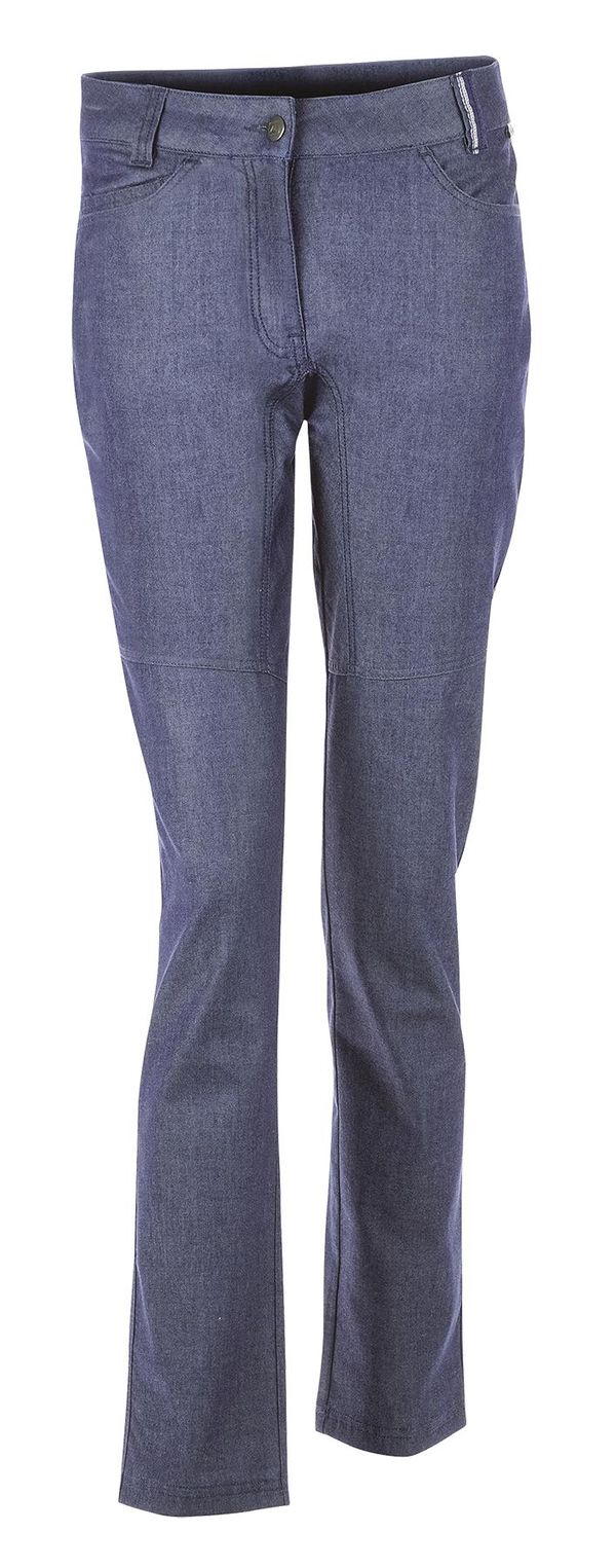 Pantalon femme. Ceinture droite à passants, dont une avec twill appliqué à l'avant gauche. Braguette à glissière avec 1 bouton rivet. Rehausse dos. Empiècement d'aisance à l'entrejambe. 2 poches cavalières. Poche ticket. 2 poches revolver. E.J. : 78 cm.
