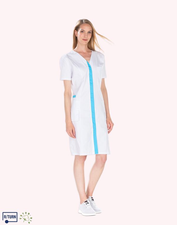 Tunique encolure V. Fermeture milieu devant par boutons-pression, parement contrasté. Découpe de cintrage. Poche poitrine, poche BIP. 2 poches basses semi-volantes. 2 fentes dos. Longueur : 75 cm.