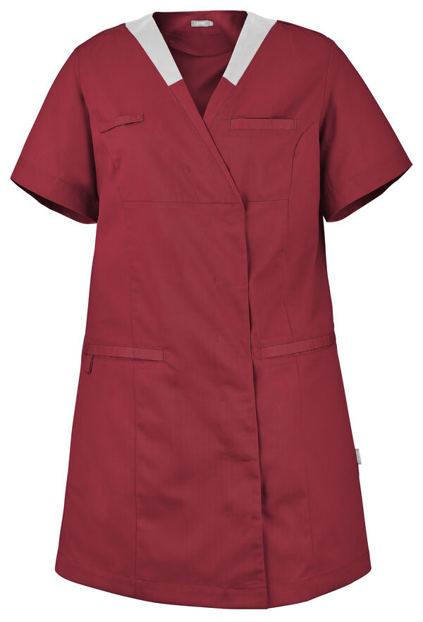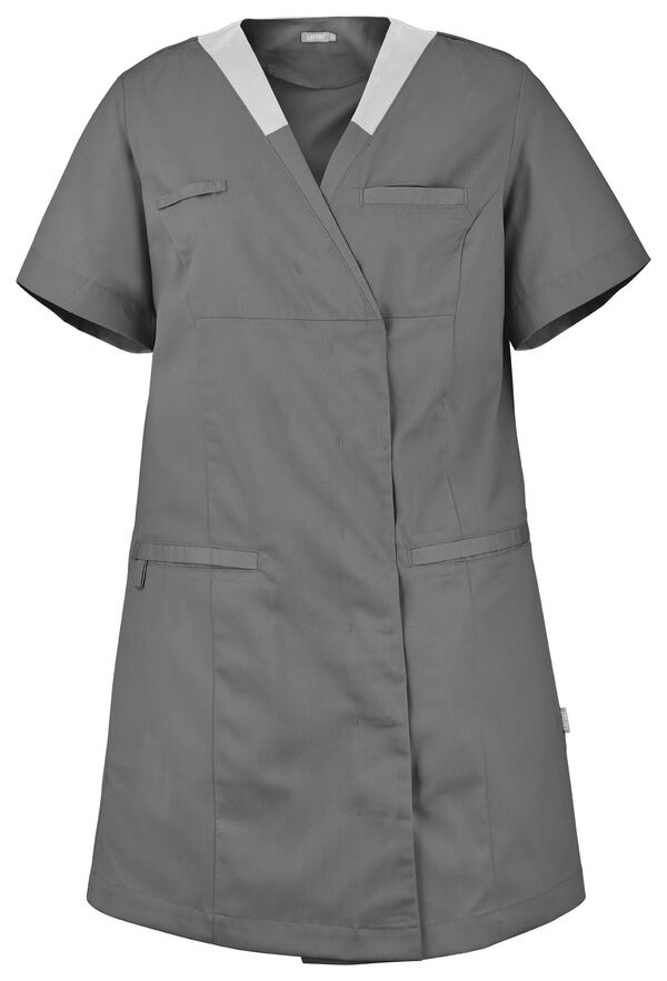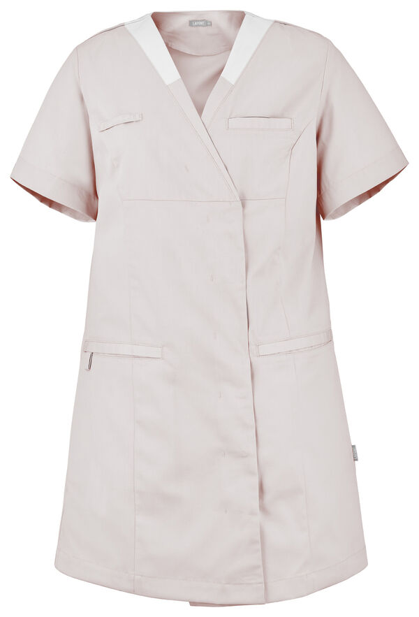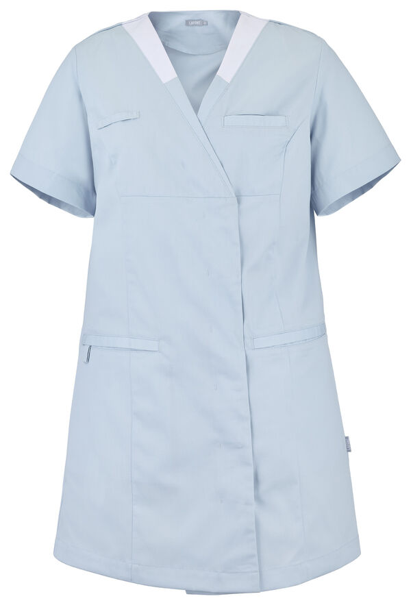 Tunique femme. Encolure V contrastée, collerette de marquage intérieur. Fermeture croisée par grippers cachés. Découpes princesses. Poche poitrine passepoilée. 2 poches basses passepoilées. Passant porte-badge. Manches courtes. Longueur : 85 cm.