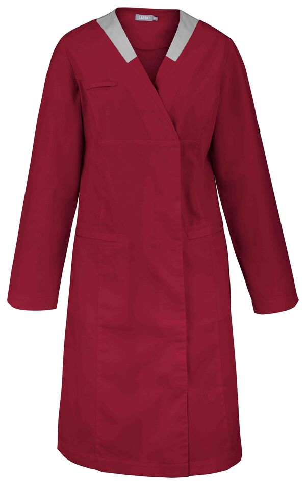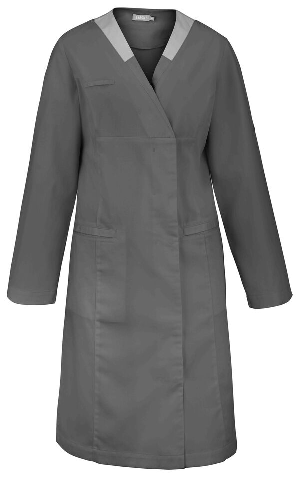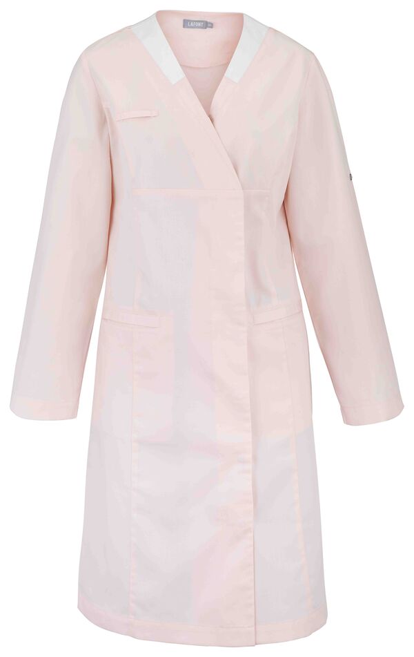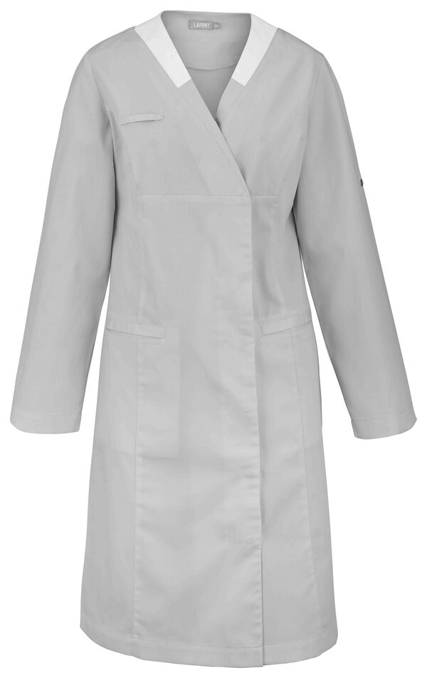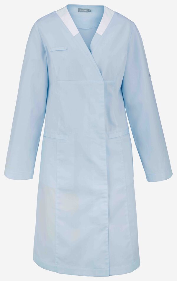 Blouse femme. Encolure V contrastée, collerette de marquage intérieur. Fermeture croisée par grippers cachés. Découpes princesses. 2 poches basses passepoilées. Passant porte-badge. Manches transformables. Longueur : 100 cm.