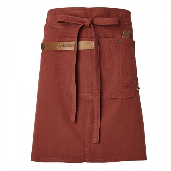 Tablier. Ceinture nouée, accroche torchon amovible en cuir, rivets de renfort. Grande poche multi-compartiments avec ruban selvedge, fente milieu devant bas. Canvas. Longueur : 50 cm.