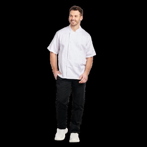 Veste homme à col officier. Double boutonnage par boutons-pression calottées. Oeillets d'aération. Poche intérieure gauche. Poche stylo sur manche gauche. Fentes d'aisance en bas du dos.