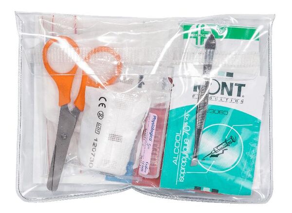 Pochette de secours de type "multirisques". Fermeture par adhésif repositionnable. Contient tous les éléments pour apporter les premiers soins aux blessures légères pour 1 personne.