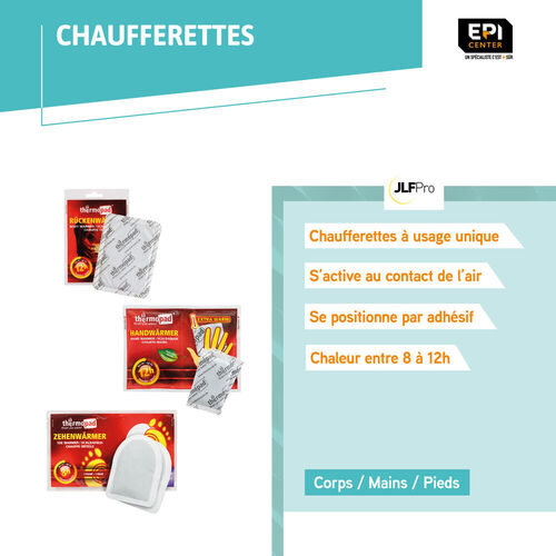 Les chaufferettes à usage unique apportent également une excellente source de chaleur dans des conditions extrêmes. Elles peuvent être positionnées dans les chaussures, les gants ou bien même sur n’importe quelle partie du corps.